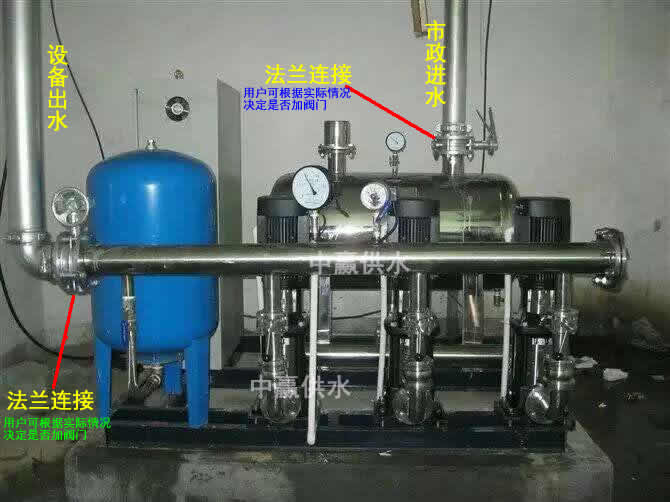 1、本設備進出水口都為法蘭,故市政進水管和小區(qū)地下室主管道也都應用法蘭,以方便法蘭對法蘭連接。